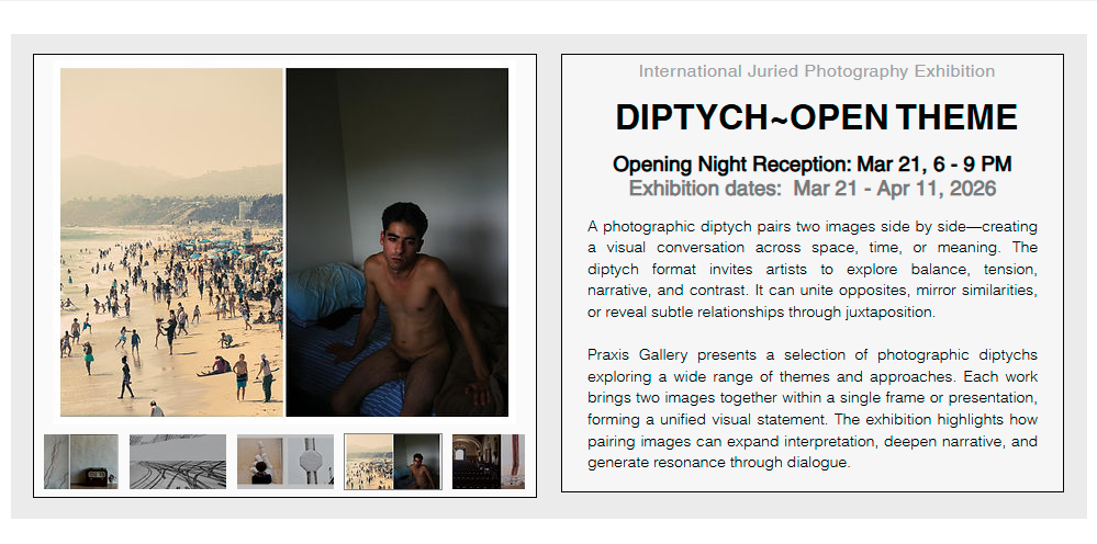 "Praxis Gallery presents a selection of photographic diptychs exploring a wide range of themes and approaches. Each work brings two images together within a single frame or presentation, forming a unified visual statement. The exhibition highlights how pairing images can expand interpretation, deepen narrative, and generate resonance through dialogue."