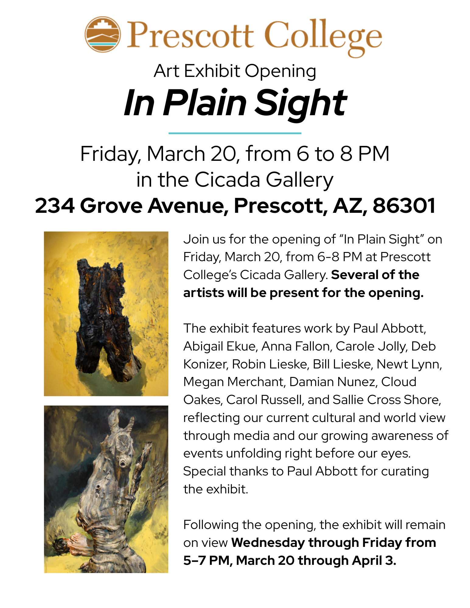 In Plain Sight opens March 20 in Cicada Gallery at Prescott College. The exhibit features art that reflects our current cultural and world view through media and our growing awareness of events unfolding right before our eyes.